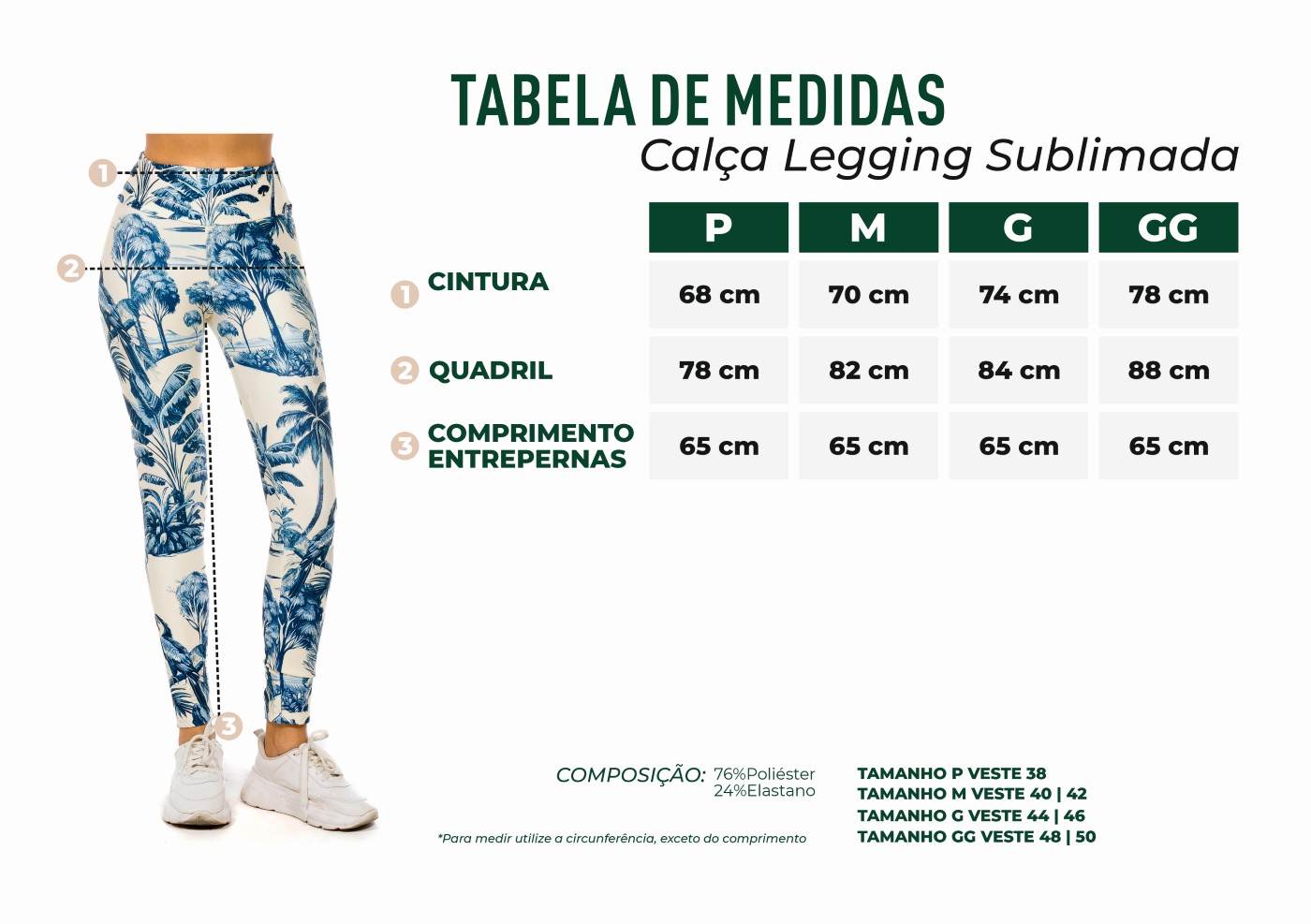 Sua composição é de 76% Poliéster e 24% Elastano, garantindo resistência, durabilidade e excelente elasticidade. O cós largo assegura um ajuste firme e confortável ao corpo, valorizando a silhueta sem apertar, além de oferecer suporte ideal para treinos mais intensos.