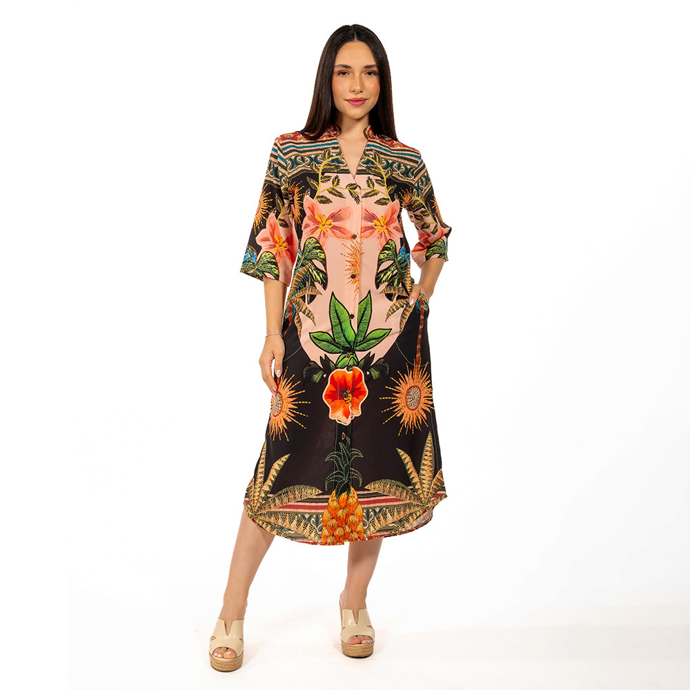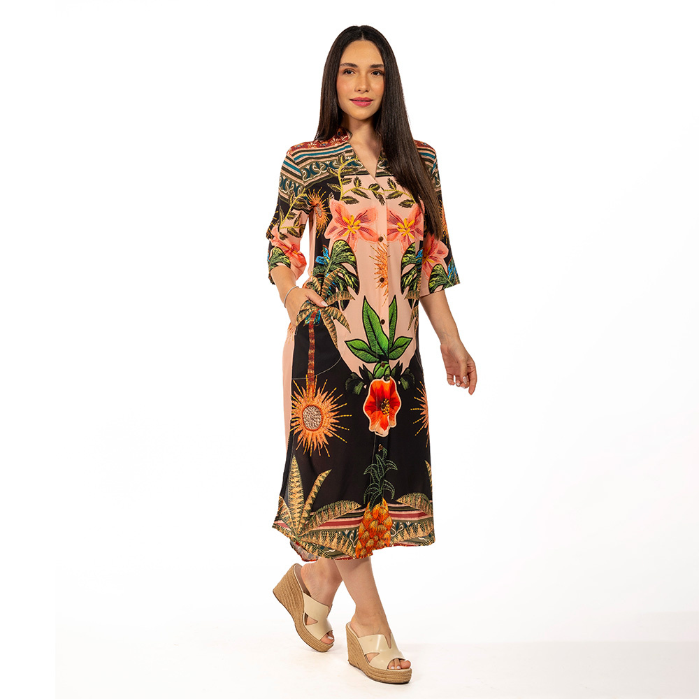 A chemise midi é a peça desejo do verão! Os detalhes da manga 3/4 com modelagem fluída proporciona muito conforto e elegância para o look. A chemise tem abertura na frente e opção de usar fechada com botões de casca de coco, estampas exclusivas, que combinam as cores do verão, o modelo midi dá simetria e valoriza o corpo da mulher.