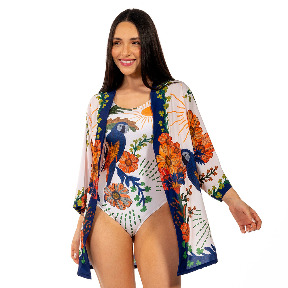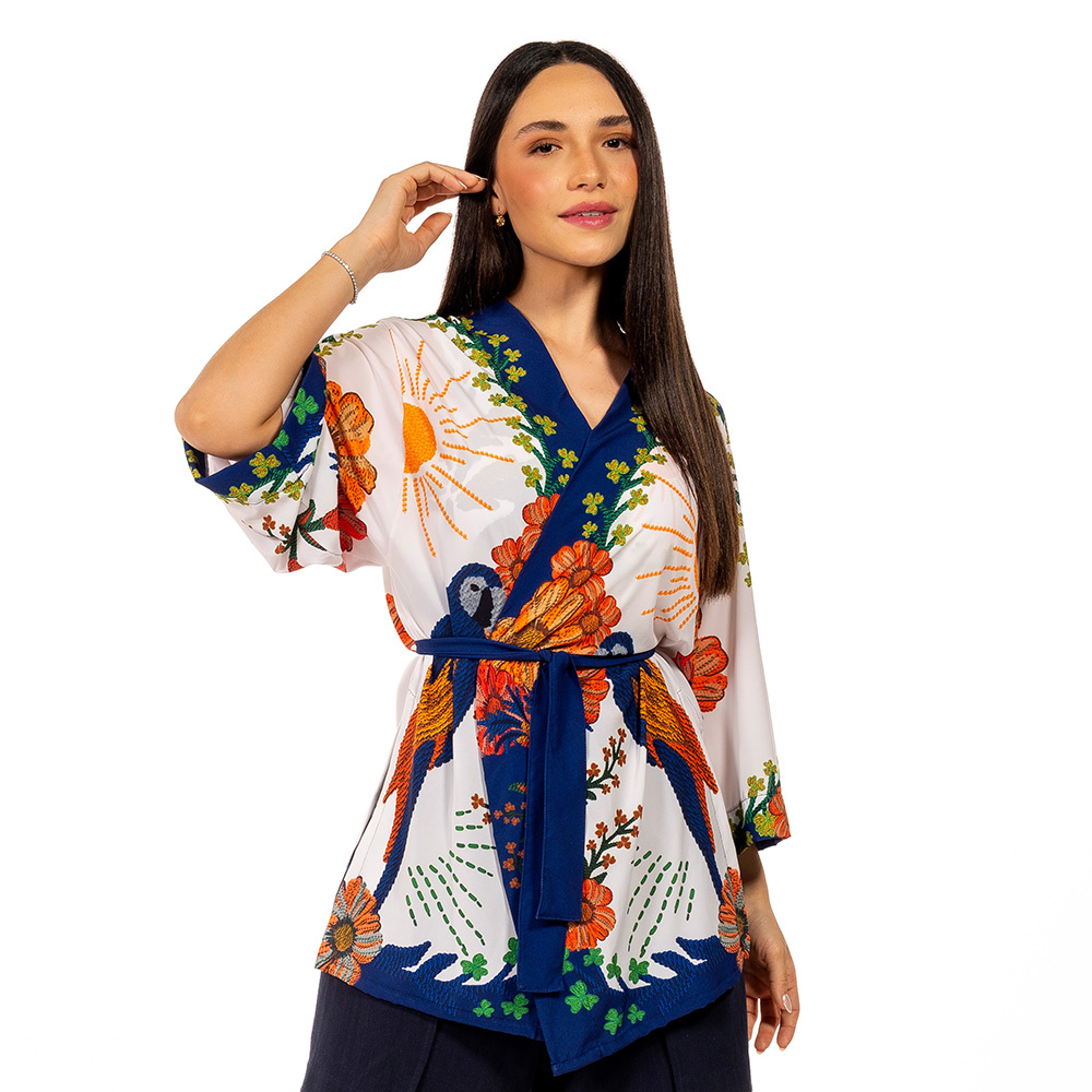 Este kimono feminino é confeccionado em tecido plano leve. Nossas estampas traduzem toda nossa brasilidade e nosso amor pela fauna e flora. A manga é ¾ e o caimento é soltinho. Possui fendas laterais o que deixa o seu look super descontraído. Nosso kimono possibilita vários tipos de amarrações, traduzindo um look para cada ocasião. Nosso kimono é tamanho único vestindo do 36 ao 46. Já comprou o seu?