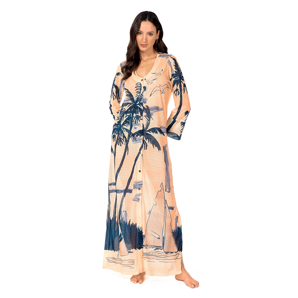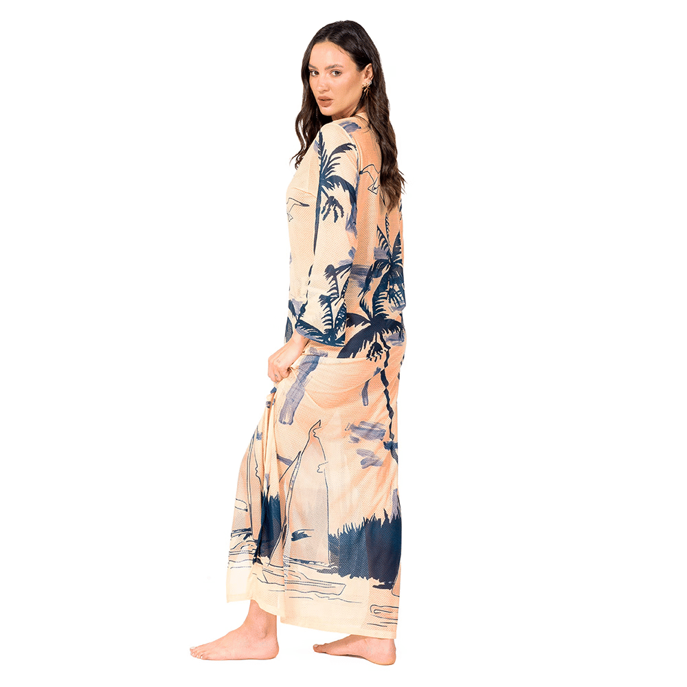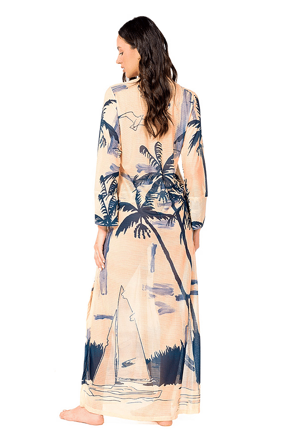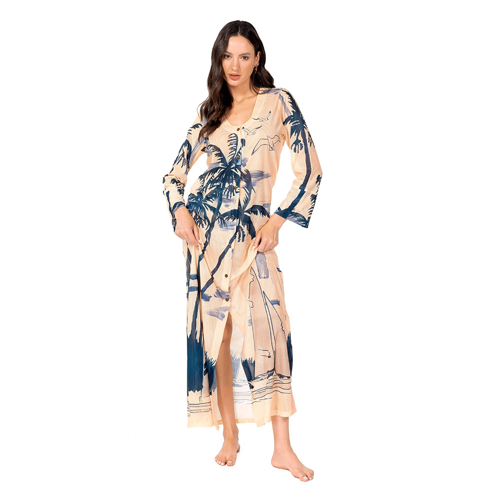 A saída de praia Trancoso é a peça desejo do verão! Os detalhes da manga longa e a modelagem longa, fluída e fendas nas laterais proporcionam muito conforto e elegância para o look de praia. A saída de praia longa tem abertura na frente e opção de usar fechada com botões de casca de coco, leve transparência e estampas exclusivas, que combinam as cores do verão com um pouco de sensualidade, o modelo longo dá simetria e valoriza o corpo da mulher. Escolha uma das nossas estampas exclusivas, são tantas cores para combinar com vários modelos de biquínis e maios!