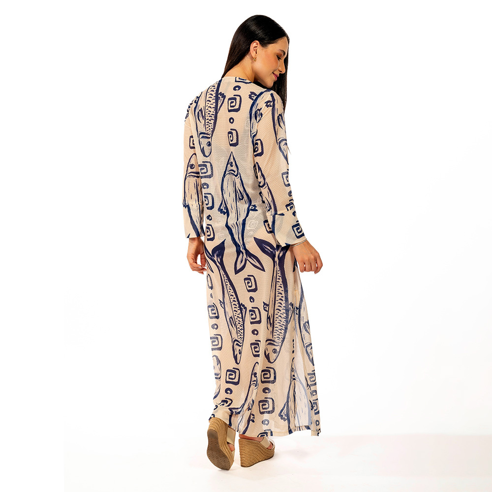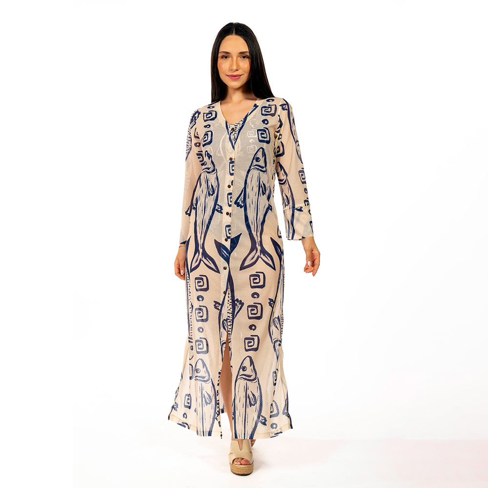 A saída de praia Trancoso é a peça desejo do verão! Os detalhes da manga longa e a modelagem longa, fluída e fendas nas laterais proporcionam muito conforto e elegância para o look de praia. A saída de praia longa tem abertura na frente e opção de usar fechada com botões de casca de coco, leve transparência e estampas exclusivas, que combinam as cores do verão com um pouco de sensualidade, o modelo longo dá simetria e valoriza o corpo da mulher. Escolha uma das nossas estampas exclusivas, são tantas cores para combinar com vários modelos de biquínis e maios!