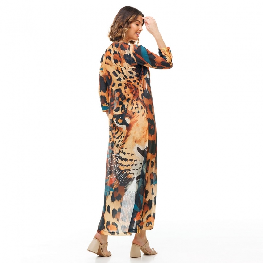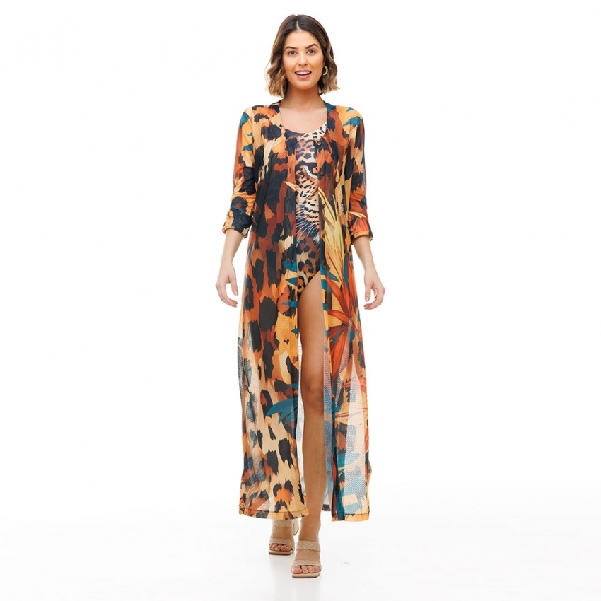 A saída de praia Cancún é a peça desejo do verão! Os detalhes da manga longa e a modelagem longa, fluída e fendas nas laterais proporcionam muito conforto e elegância para o look de praia. A saída de praia longa tem abertura na frente e opção de usar fechada com botões de casca de coco, leve, transparência e estampas exclusivas, que combinam as cores do verão com um pouco de sensualidade, o modelo longo dá simetria e valoriza o corpo da mulher. Escolha uma das nossas estampas exclusivas, são tantas cores para combinar com vários modelos de biquínis e maiôs!