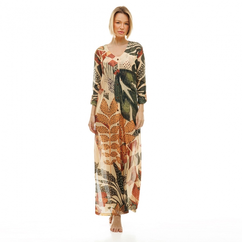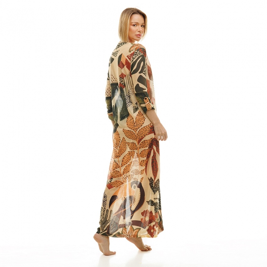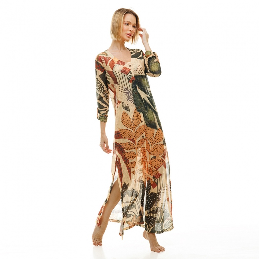 A saída de praia Cancún é a peça desejo do verão! Os detalhes da manga longa e a modelagem longa, fluída e fendas nas laterais proporcionam muito conforto e elegância para o look de praia. A saída de praia longa tem abertura na frente e opção de usar fechada com botões de casca de coco, leve, transparência e estampas exclusivas, que combinam as cores do verão com um pouco de sensualidade, o modelo longo dá simetria e valoriza o corpo da mulher. Escolha uma das nossas estampas exclusivas, são tantas cores para combinar com vários modelos de biquínis e maiôs!